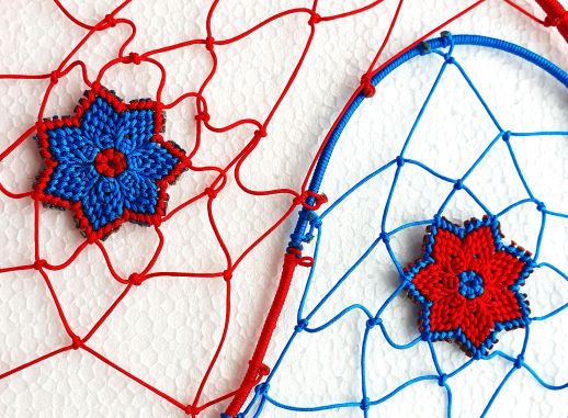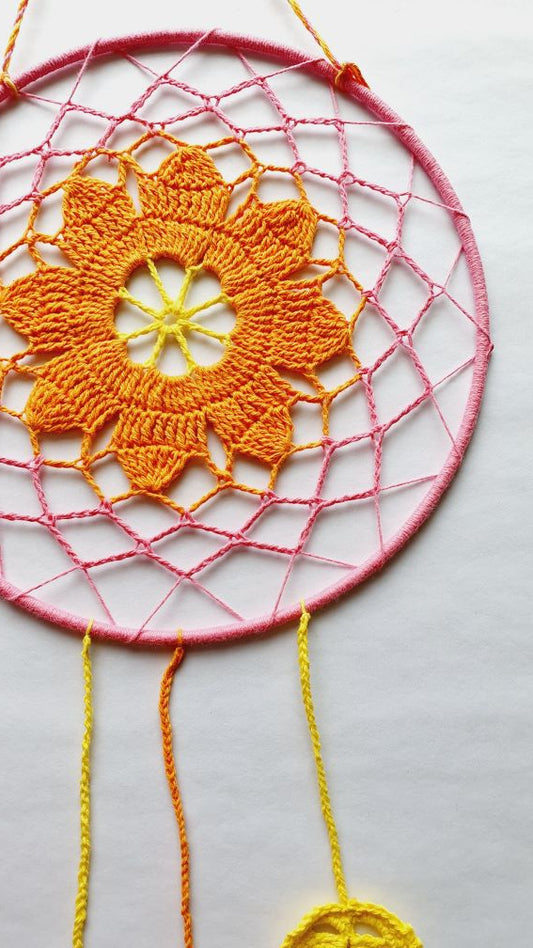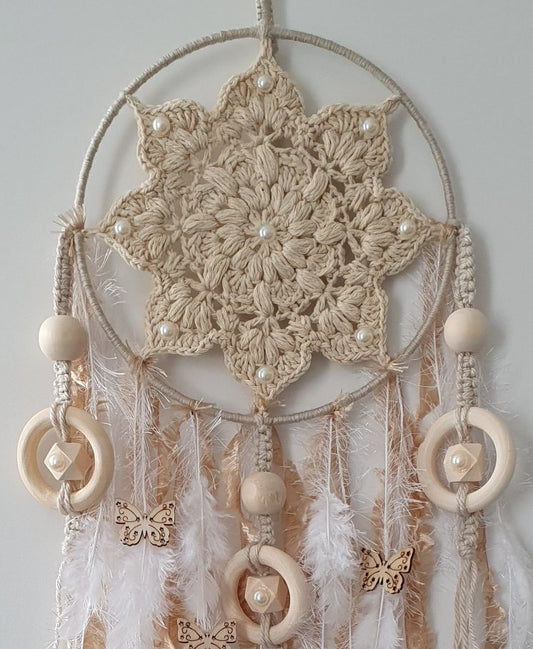 Boho Dreamcatcher with White & Beige Feathers – Handmade Crochet Star & Wooden Accents